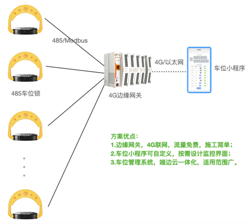 二、方案構(gòu)成 專用車位管理解決方案有2種比較常見的落地形式: 一是獨(dú)立的車位管理系統(tǒng),提供車位鎖、4G網(wǎng)關(guān)、車位小程序,比如酒店、寫字樓、單位、場館、醫(yī)院、學(xué)校、4S店等小型停車場所,通過車位鎖管控車位并監(jiān)測車位狀態(tài),通過小程序遠(yuǎn)程控鎖,有權(quán)限車輛降鎖后駛?cè)耄瑹o權(quán)限車輛不降鎖,從而實(shí)現(xiàn)車位使用權(quán)限遠(yuǎn)程管理。 二是作為智慧XX系統(tǒng)的專用車位管理模塊,提供車位鎖、4G網(wǎng)關(guān)和物聯(lián)網(wǎng)平臺,為智慧XX平臺企業(yè)/系統(tǒng)集成商提供物聯(lián)網(wǎng)平臺對接接口,作為復(fù)雜智慧XX系統(tǒng)的車位管理子系統(tǒng),完成車位信息采集、車位管控、設(shè)備管理等功能。 三、產(chǎn)品介紹 1.4G邊緣網(wǎng)關(guān) 4G邊緣網(wǎng)關(guān)集成了邊緣采集和計(jì)算、IO 采集和控制、點(diǎn)位聯(lián)動、點(diǎn)位讀寫、數(shù)據(jù)透傳、快速上云和數(shù)據(jù)加密等多種核心功能。工業(yè)級設(shè)計(jì),數(shù)據(jù)傳輸穩(wěn)定,同時(shí)支持網(wǎng)口和 4G 網(wǎng)絡(luò),通信方式更加多樣化。產(chǎn)品支持 TCP/UDP/MQTT(S)/HTTP(S)等協(xié)議通信,支持 Modbus RTU/TCP 協(xié)議轉(zhuǎn)換和 Modbus/Json 協(xié)議數(shù)據(jù)上報(bào)。產(chǎn)品更是嵌入了有人云、阿里云和 AWS、微軟云等常用平臺的接入,方便客戶和平臺的對接。